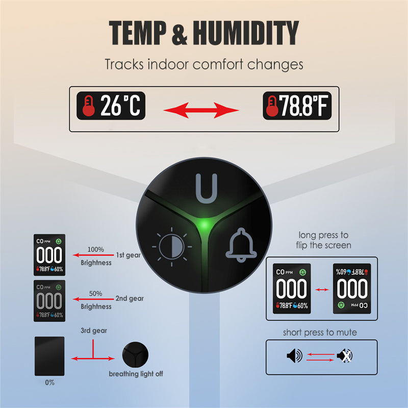 AUDIBLE & VISUAL ALARMS - Featuring dual sound and light alerts, the alarm immediately notifies you of potential risks. With green, yellow, orange, and red indicator lights, plus corresponding sound alarms, you can easily identify the level of danger and respond quickly.